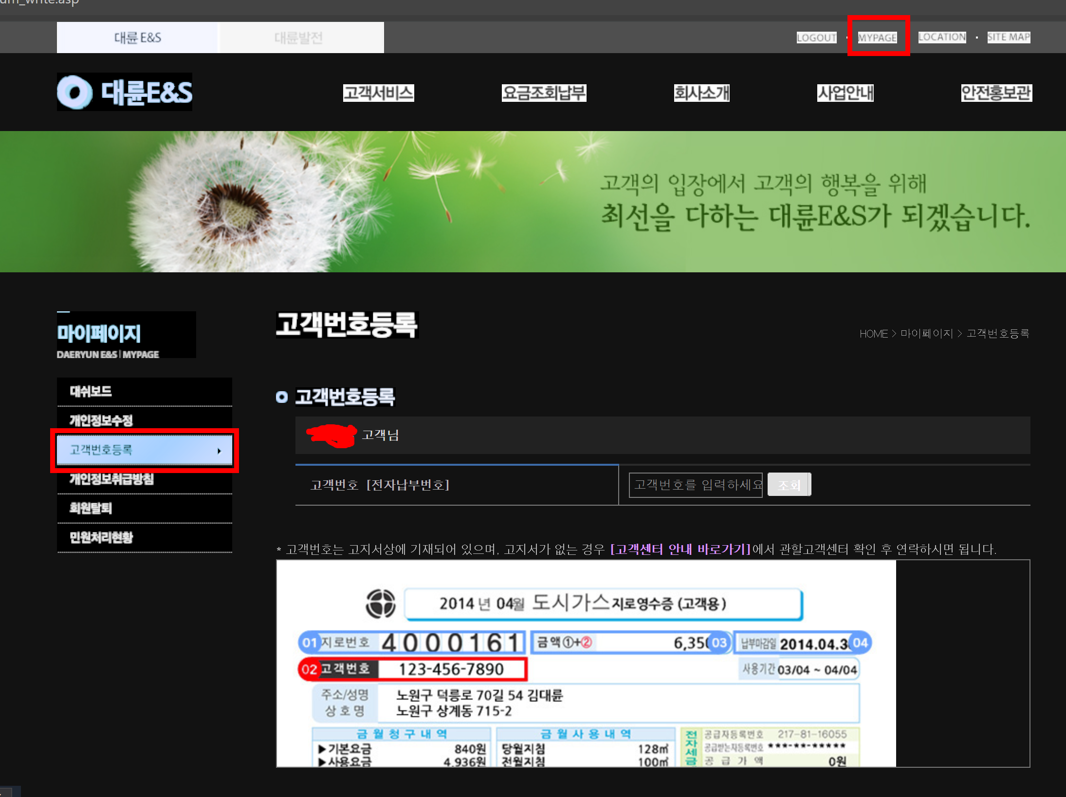 이제 로그인을 해주시고, 마이페이지 - 고객번호 등록으로 가주시고 지로용지에 있는 고객번호를 입력하고 조회를 눌러줍니다.