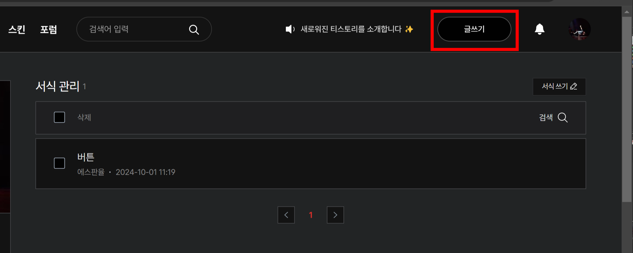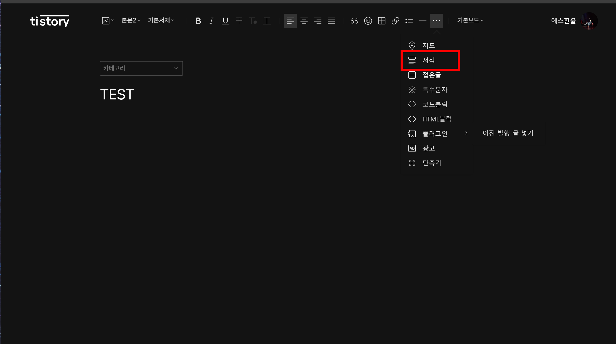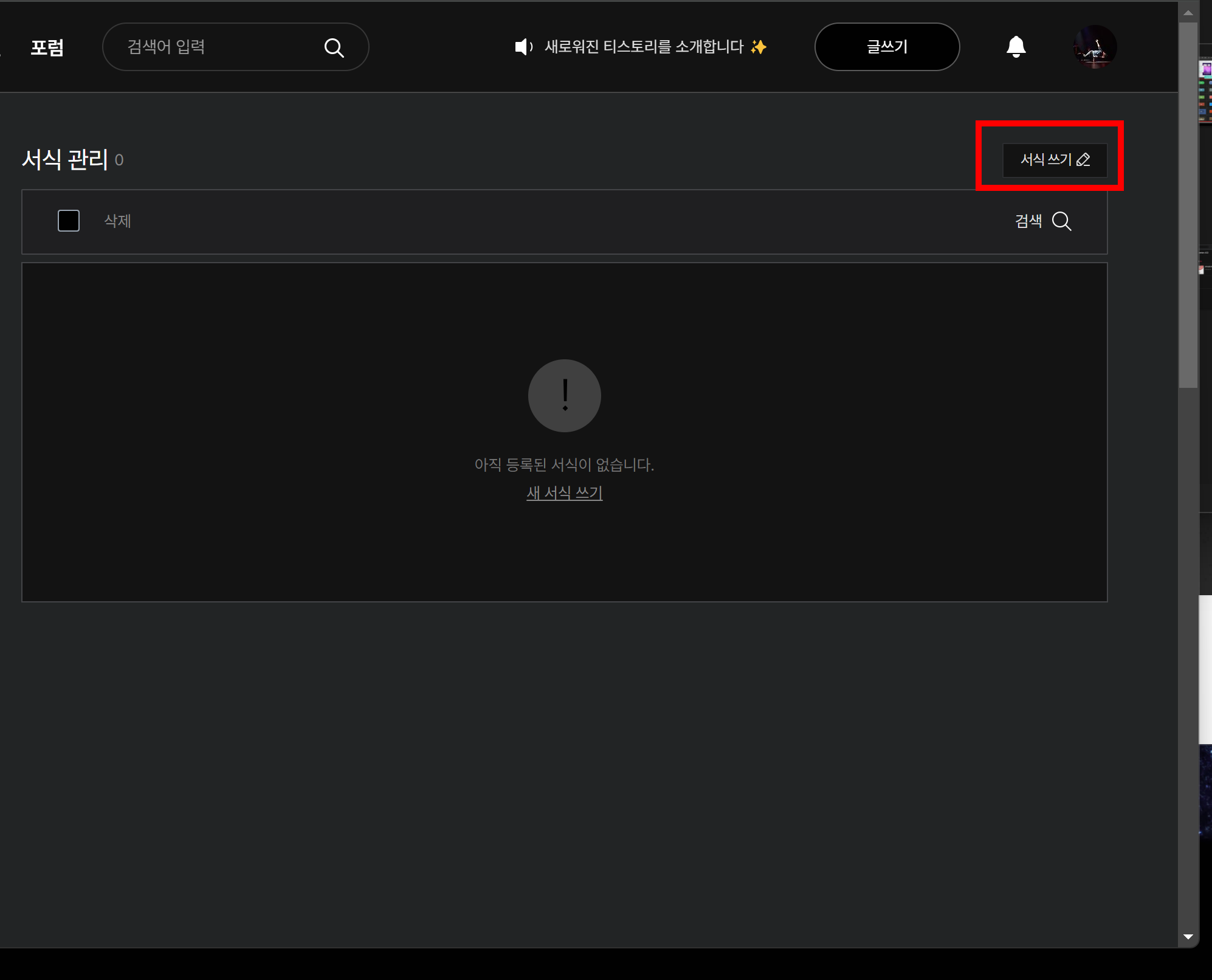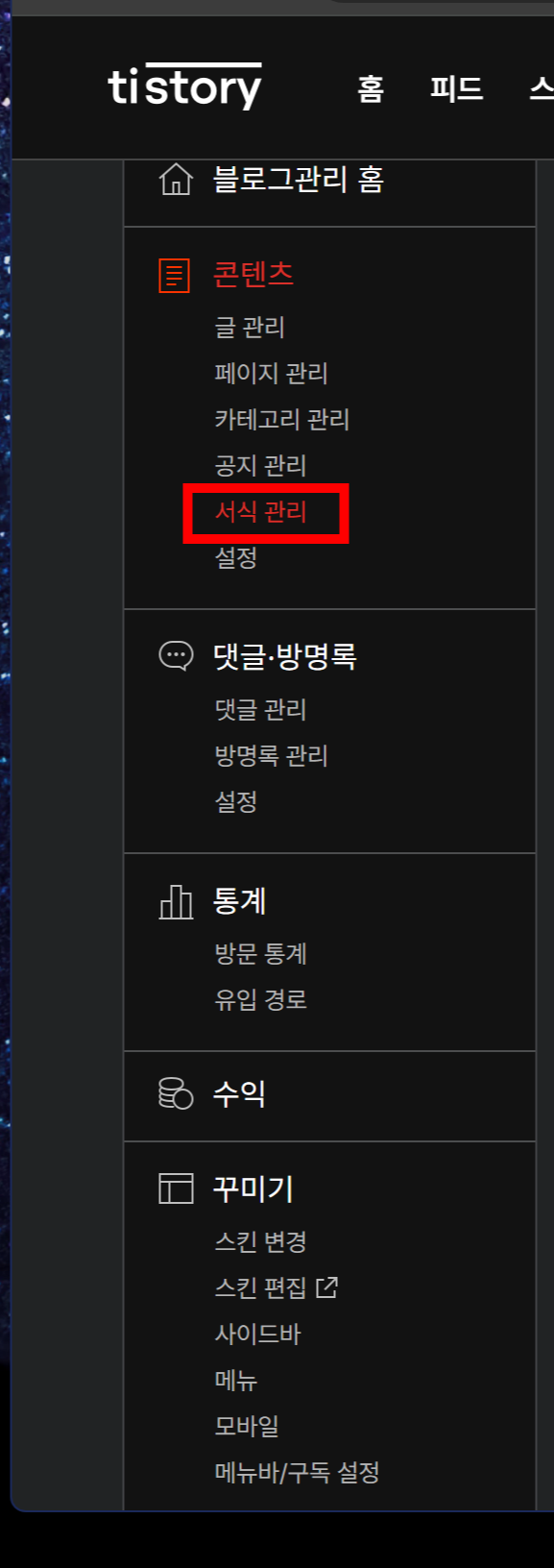 - 티스토리에서 콘텐츠 - 서식관리 - 서식쓰기를 눌러준다.