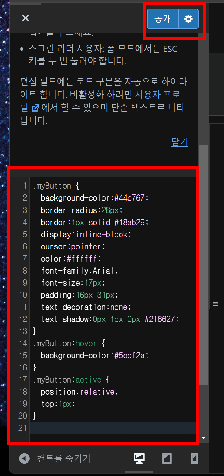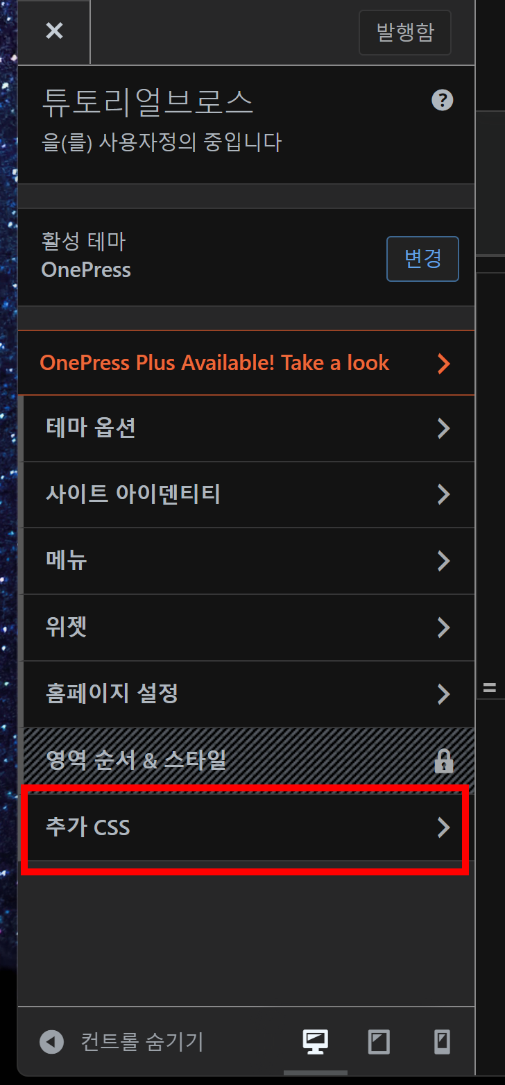 추가 CSS 클릭후 복사한 코드를 넣고 공개를 눌러줍니다.