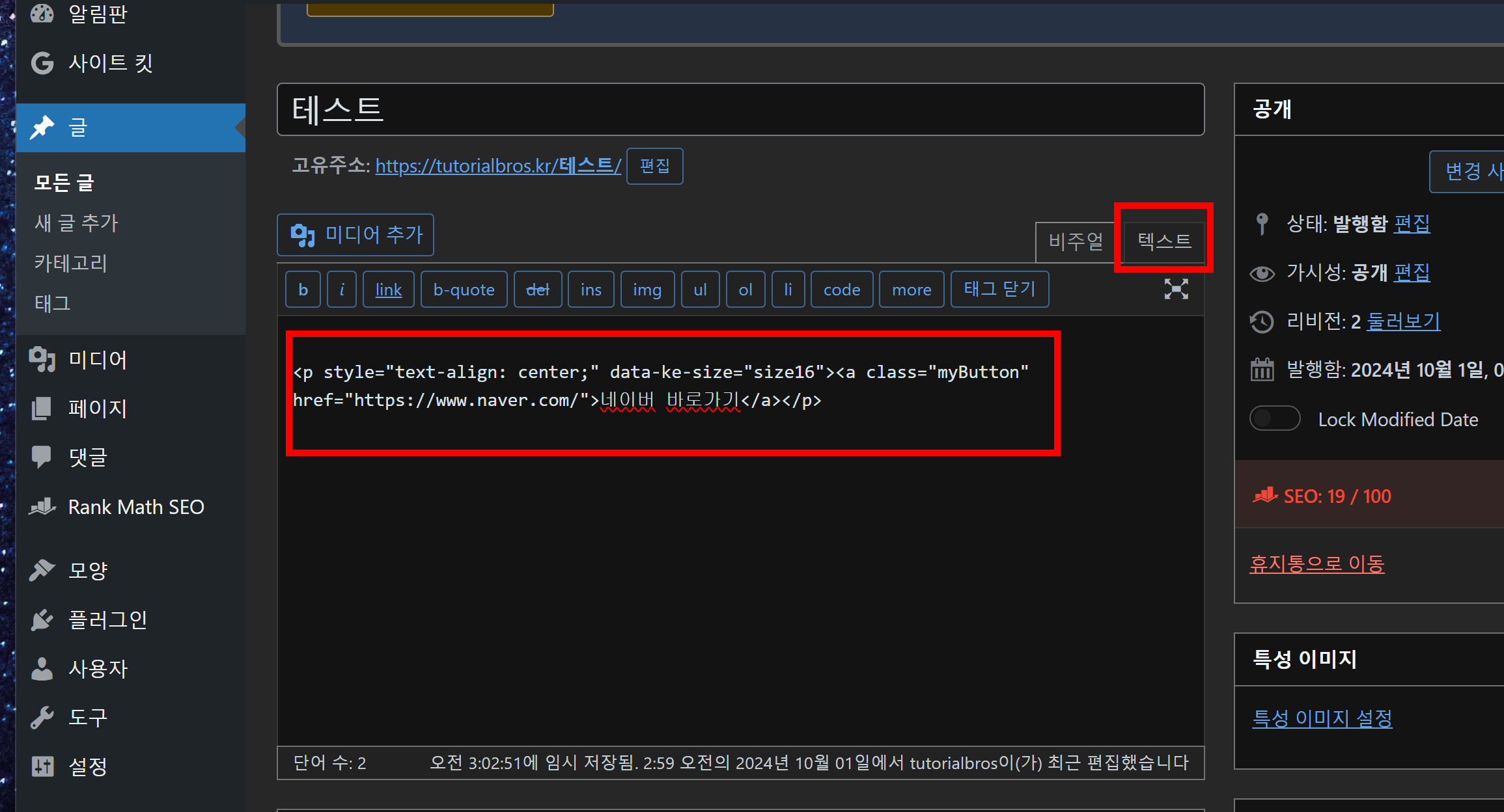 - 텍스트 모드에서 HTML을 복사해서 붙여 넣는다.