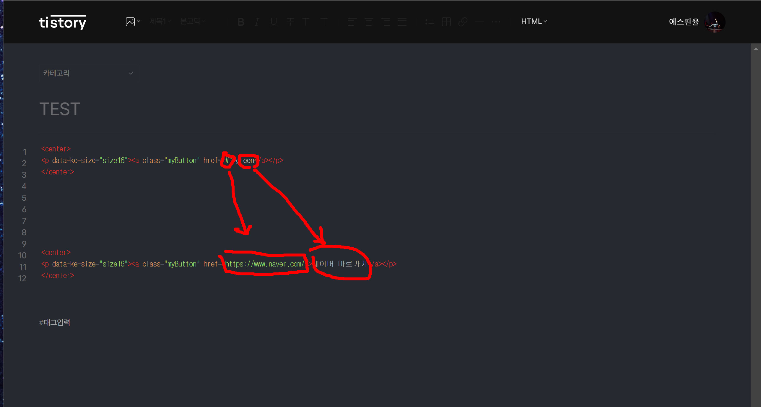 - 글쓰기 모드를 HTML로 변경한다.