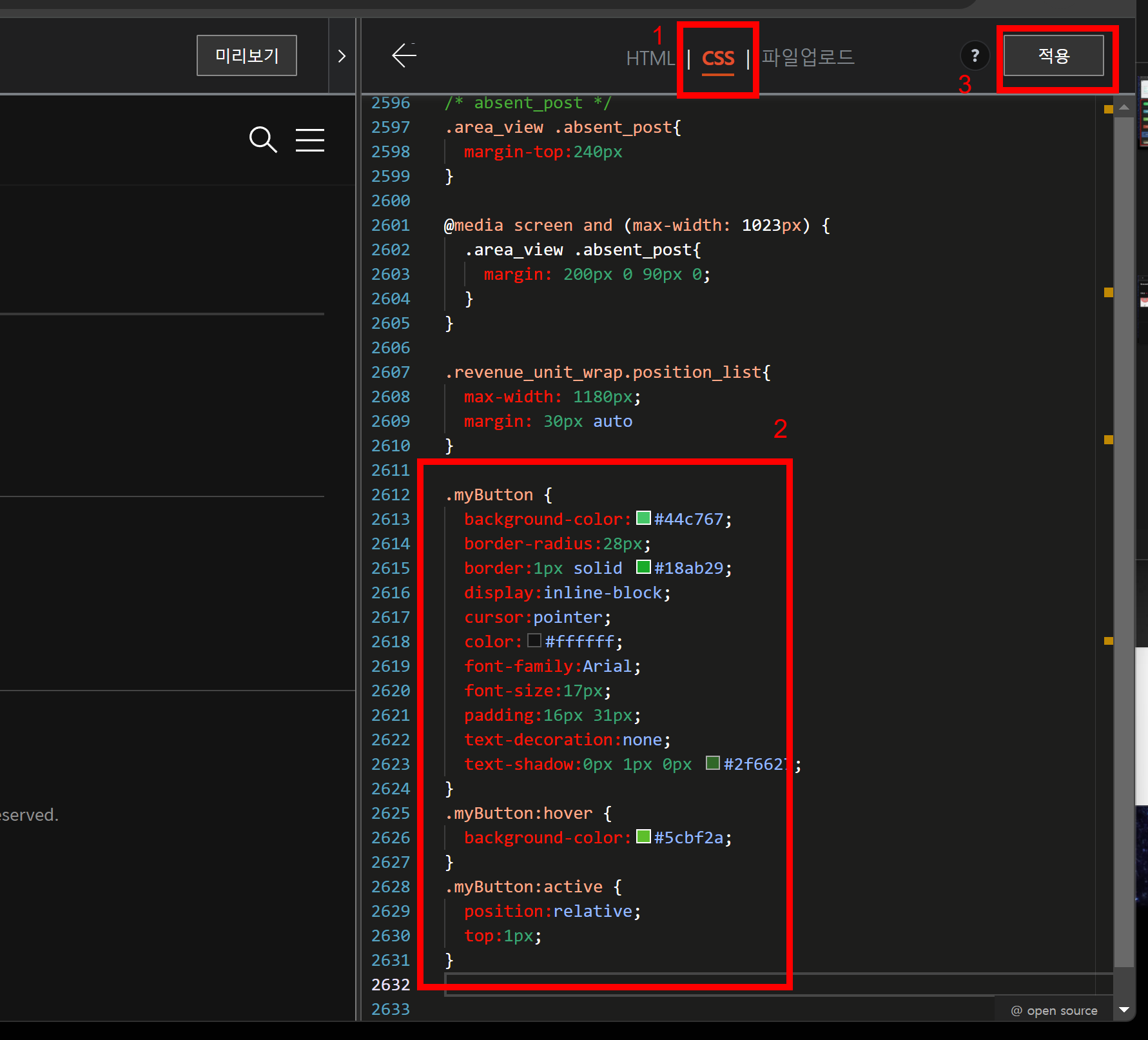 추가 CSS 클릭후 복사한 코드를 넣고 공개를 눌러줍니다.